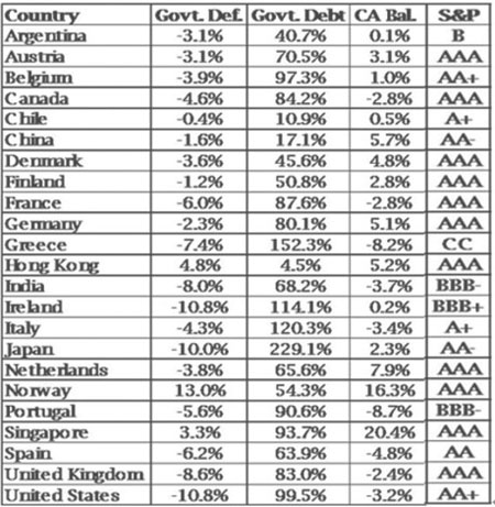 下表為23個國家的政府赤字、債務(wù)以及經(jīng)常帳,下述的數(shù)字均為與其GDP的比例。最后一欄是它們的標(biāo)普評級。