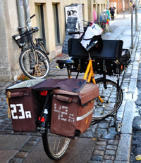 丹麥政府為了鼓勵人民騎車出行,也算是想盡了各種辦法?纯聪旅孢@輛自行車是干啥用的(圖3)?這樣的改造,也算獨具匠心了吧。其實這是郵遞員騎的自行車,為支撐前面的大箱子,還專門設(shè)計了小輪子(見下圖)。