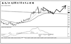 美元兌瑞郎在創(chuàng)出0.7070的低點(diǎn)之后強(qiáng)力反彈,接連升破了兩條下降壓力線的阻力,同時(shí),4小時(shí)圖均線系統(tǒng)已經(jīng)形成多頭排列,瑞郎的強(qiáng)勢(shì)基本告一段落。目前匯價(jià)在對(duì)此前的上漲進(jìn)行修正,短線再度回抽趨勢(shì)線的希望較大,此后有望繼續(xù)上行,向周線圖趨勢(shì)線阻力0.8300一帶挺近。