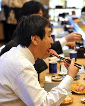 記者注意到,這里壽司上的魚片要比別的地方長,幾乎像一個軟殼從上到下把米飯整個包住。相比之下,米飯的量顯得比其他壽司店少。店主說,在這里,魚和肉的最佳比例也是祖?zhèn)鞯摹!斑@種比例,可以讓客人將魚的鮮美品味到極致。本來,壽司店里魚是主角,飯是配角。但現(xiàn)在很多快餐式的壽司,反而讓人感覺在吃飯,體味不到魚的香味!
