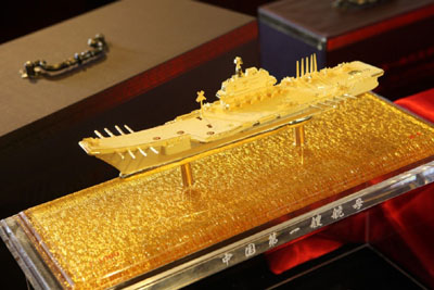 為紀(jì)念中國第一艘航空母艦問世,中國人民革命軍事博物館與上海昶昱投資有限公司聯(lián)合發(fā)行中國第一艘航空母艦?zāi)P。?jù)悉,“中國第一艘航空母艦”微縮模型以中國第一艘航空母艦為原型,純金版微縮比例1:1680,采用50克.999黃金純手工打造,全國限量發(fā)行50000套。銅鍍金版艦長304mm,艦寬70.5mm,微縮比例1:1000,限量發(fā)行80000套。每套均配有收藏證書,且有獨(dú)立編號。