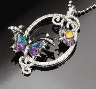 比如使用著名的Paraiba碧璽,這種碧璽于1989年首次在巴西被發(fā)現(xiàn),在此之前沒有任何一種珠寶擁有如此電光霓虹色,在珠寶界引起轟動(dòng)。很多人形容它的顏色只有在夢中才能見到,又有人坦言看到Paraiba風(fēng)采的感覺就如一見鐘情;又因產(chǎn)量極稀,晶體極小,鶴立于所有碧璽,自成一派,價(jià)格昂貴。ISALISSE卻使用稀世的5克拉以上的Paraiba碧璽制作一枚胸針,模擬蝴蝶和瓢蟲嬉戲情景,憨態(tài)可掬。