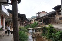 下梅村離武夷山不遠(yuǎn),幾乎是順路就過去了。初到下梅,時近黃昏。夕陽為村子撒上一層金,似罩上一層已古舊了但仍然輝煌的薄紗。村子北面是被云霧環(huán)繞的群山,幾朵云不時脫離群體飄出來,靜謐無言地俯視眾生。如果抬頭望天的人偶然撞上它們的視線,或許會發(fā)現(xiàn)那其中藏著安然和幾分狡黠。