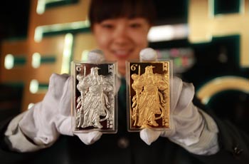 近日,為配合中國郵政2011年9月《關(guān)公》郵票發(fā)行,中國集郵總公司同步限量發(fā)行郵票金磚系列之第六組——《關(guān)公》郵票金銀磚面世發(fā)行。 其中兩款產(chǎn)品正面圖案首次采用高浮雕雕刻,使金銀磚關(guān)公像圖案的立體感更加突出。同時(shí),為了增強(qiáng)產(chǎn)品的收藏性、防偽性和唯一性功能,在各款產(chǎn)品中對(duì)應(yīng)配放與金磚背面編號(hào)一致的收藏證書一本。