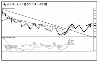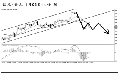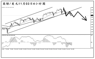 澳元兌美元的此波下跌將圖中的上升趨勢(shì)線跌破,均線系統(tǒng)已經(jīng)形成壓制排列。澳元重新挑戰(zhàn)1.1000的進(jìn)程再度受阻,預(yù)計(jì)后市繼續(xù)發(fā)生下挫的概率較大。4小時(shí)圖MACD仍處于空頭動(dòng)能充盈的階段。澳元若發(fā)生回調(diào),也很難重新升破趨勢(shì)線,操作上以小倉(cāng)做空為主。