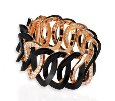 ubetto系列,有的以精湛工藝處理的黑色金屬搭配黑鉆、體現(xiàn)神秘優(yōu)雅的女性魅力,有的則在白色K金或玫瑰金上點綴白鉆,展現(xiàn)溫婉風(fēng)情。不變的是簡潔犀利的線條造型,簡單的結(jié)構(gòu)充滿藝術(shù)美學(xué)。Pigna系列出人意料,充滿想像力,靚麗大氣。Incrocio系列完美融合了天然炭黑樹脂與玫瑰金兩種材質(zhì),以不對稱的造型呈現(xiàn)濃烈的巴洛克風(fēng)格。