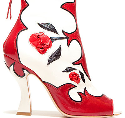 永遠(yuǎn)青春浪漫的Miu Miu在2012春夏鞋履系列中將立體的皮革花朵裝飾作為主要設(shè)計(jì)創(chuàng)意。線條分明的花紋拼接皮鞋表面點(diǎn)綴色彩艷麗的花朵,呈現(xiàn)出嬌艷、活力的少女情懷。從淺口鞋、短靴到長靴一應(yīng)俱全的款式也是甜美女生們最寵愛的單品。