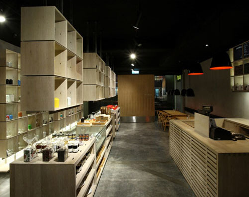J?rgensen之手。茶館分兩層,一層擺放及產(chǎn)品展示架及木制家具,二層則是用餐室。木材與混凝土結(jié)合起來(lái)的室內(nèi)別具一番清新、自然的美感,與茶的細(xì)致、微妙相互融合,自然會(huì)勾起顧你與茶呼應(yīng)的無(wú)限情懷。