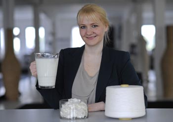 研究期間,多馬斯克測試不同動物的乳汁,包括綿羊、山羊、牛等,結(jié)果發(fā)現(xiàn)只有牛奶中的酪蛋白適合形成纖維。她說:“牛奶中所含蛋白質(zhì)有益皮膚,牛奶纖維可以使人的皮膚保持年輕。”