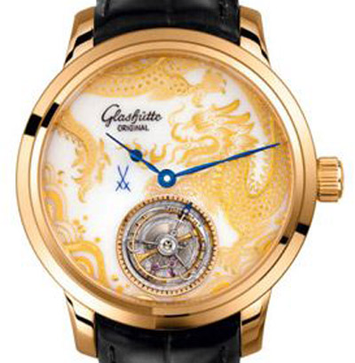 格拉蘇蒂(Glashütte Original ) 以超凡的梅森陀飛輪龍年限量腕表,迎接即將來臨的龍年。德國(guó)頂級(jí)制表廠格拉蘇蒂創(chuàng)制了八支獨(dú)一無二的時(shí)計(jì),每只均配備梅森瓷廠制作的陶瓷盤面,飾以人手繪制的精美龍形圖案,以含有純金粉的陶瓷顏料繪成。 經(jīng)高溫處理后,顏料緊附在表面上,呈現(xiàn)金色啞光;技藝高超的畫師繼而以瑪瑙筆為金龍加工,使之輪廓分明,耀眼生輝。