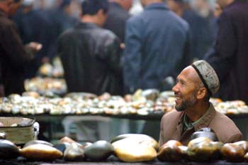 在烏魯木齊的玉石“巴扎”,一名玉石商人在等待顧客光臨。記者