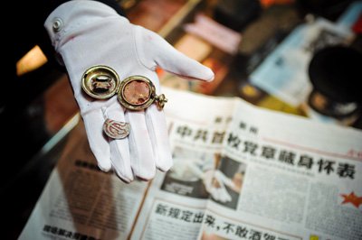 圖為紅色收藏博物館內(nèi)收藏的中國共產(chǎn)黨首枚黨章,這枚黨章藏在一個仿懷表的外殼內(nèi)。