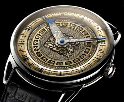 Rothen手工凋刻而成,并嵌入31藍鋼令表盤。小時圈顯示瑪雅數(shù)字系統(tǒng)的數(shù)字,而內(nèi)圈則顯示了代表瑪雅日歷中每個周期20天的20個神靈、動物和圣物的圖像字符。