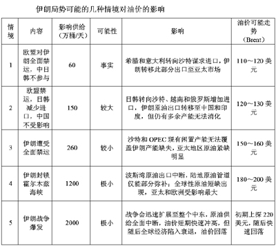 此外,對(duì)于伊朗局勢(shì)可能的幾種情境,我們做出以下歸類(見(jiàn)下表)。其中情境1、2和3之間的跨度較大,而在情境3下,伊朗遭受全面制裁后到情境4和5的演變將會(huì)較為迅速。一旦伊朗爆發(fā)戰(zhàn)事,將會(huì)引發(fā)中東原油生產(chǎn)的全面停滯。從目前事態(tài)的發(fā)展來(lái)看,仍處于情境1的預(yù)期之下,我們預(yù)計(jì)在7月歐洲正式對(duì)伊朗實(shí)施禁運(yùn)之后,有可能發(fā)展為情境2,而發(fā)展至情境3的可能性極小。因此,就伊朗局勢(shì)的影響而言,我們預(yù)計(jì),在一季度、二季度偏中性,而在三季度之后將對(duì)油價(jià)產(chǎn)生一定推動(dòng)。