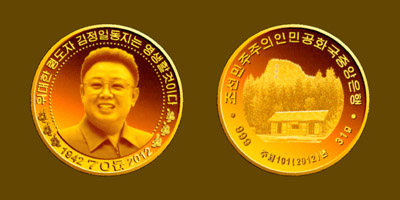 朝鮮最高人民會(huì)議常任委員會(huì)近日發(fā)布政令,宣布發(fā)行金正日誕辰70周年紀(jì)念幣。據(jù)朝鮮媒體報(bào)道,紀(jì)念幣分為金幣和銀幣。紀(jì)念幣正面中央為金正日像,外環(huán)為70個(gè)點(diǎn),上外環(huán)和下外環(huán)分別有“偉大領(lǐng)導(dǎo)者金正日同志永垂不朽”和“1942,70周年,2012”字樣,兩旁各有3朵木蘭花;紀(jì)念幣背面中央為以正日峰為背景的白頭山密營(yíng)故居,左右兩旁標(biāo)有紀(jì)念幣純度和重量,上外環(huán)有“朝鮮民主主義人民共和國(guó)中央銀行”字樣,下外環(huán)標(biāo)有發(fā)行年度。