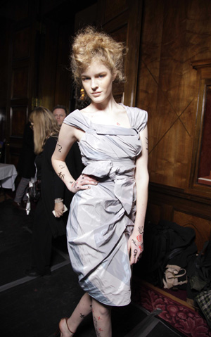 雖然以灰、藍、紫、駝色為主色調(diào)的本季時裝與韋斯特伍德過去的設(shè)計相比較為暗沉,但與原生態(tài)的民族風格圖案搭配起來更顯自然。不甘寂寞的韋斯特伍德還在其中穿插了飽滿的橙色針織衫、絲巾和酒紅色連褲襪,為寒冷的秋冬季節(jié)帶來一絲暖意。
