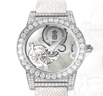 GRISOGONO又一件珠寶腕表杰作,也品牌第一款陀飛輪腕表。這全新型號包括有白鉆、黑鉆及啡鉆三個(gè)款式。閃耀的白鉆包圍著發(fā)亮般的貝母表面,配上優(yōu)雅的陀飛輪表橋曲線及大膽的設(shè)計(jì),是