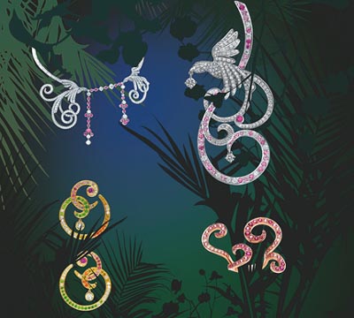 珍愛之鳥”系列珠寶。 修長的線條、豐滿的羽毛、細(xì)致復(fù)雜的卷曲花紋、令人目炫的罕貴彩色寶石,讓神話幻化成浪漫永恒,在強(qiáng)烈的動(dòng)感中展現(xiàn)Van Cleef