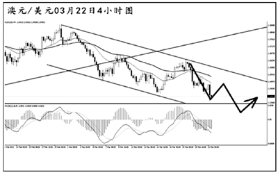 澳元兌美元未能順利殺向前方高點(diǎn)阻力1.1080,短線下跌勢頭較為迅猛,雖然中途的反彈力度也較為強(qiáng)勁,但最終都未能阻止匯價逐步創(chuàng)出短線新低。4小時圖MACD處于空頭動能充盈階段,下方近期無明顯支撐位。預(yù)計澳元仍會繼續(xù)走弱,重新挑戰(zhàn)1.0000的整數(shù)關(guān)口。
