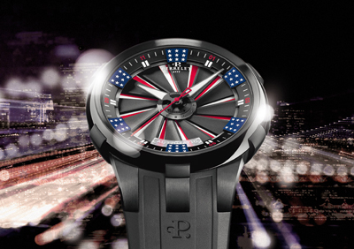 這系列之「葉輪手表」的表盤用上美國國旗上紅白間條的意念,色彩鮮明的表盤更配以12片會轉(zhuǎn)動的渦輪葉片?焖傩D(zhuǎn)手表可讓顏色隨意舞動,展現(xiàn)變化多端、永無休止的形態(tài)。萬事皆以速度定論,而沒有其他物件能夠細致重現(xiàn)如此獨特法門;鹚傩D(zhuǎn)的渦輪葉片在表面上形成一種特殊的視覺效果,并以蔚藍色小方格及純白色的碎星在傍作點綴。白色碎星的總數(shù)為50顆,以8或9顆為一組,正正是國旗上代表的州份數(shù)目。