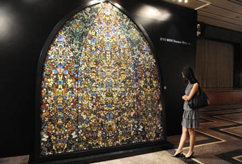 2009年10月7日,韓國(guó)首爾拍賣行現(xiàn)代及當(dāng)代藝術(shù)香港秋季拍賣會(huì)上,英國(guó)藝術(shù)家達(dá)明·赫斯特采用蝴蝶與家用光亮顏料創(chuàng)作的《他方的重要——天堂國(guó)度》,以1722.2萬(wàn)港元成交,創(chuàng)下當(dāng)時(shí)赫斯特作品在亞洲拍賣的最高成交紀(jì)錄。圖為觀眾在預(yù)展上欣賞赫斯特的該幅作品。記者 宋振平/攝 |