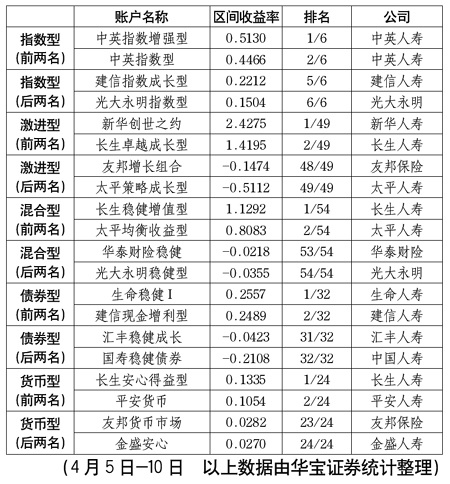 據(jù)華寶證券統(tǒng)計(jì),本月的前4個(gè)交易日(4月5日至10日),投連險(xiǎn)各分類賬戶中,與股票市場(chǎng)相關(guān)性較強(qiáng)的指數(shù)型、激進(jìn)型賬戶普遍取得正收益,但是指數(shù)型賬戶表現(xiàn)不及激進(jìn)型,也跑輸大盤,兩者均未能較好的把握本周的行情,債券型、貨幣型賬戶收益率依舊穩(wěn)健。