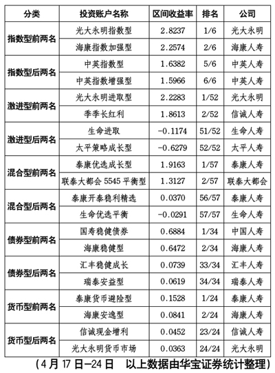根據(jù)華寶證券統(tǒng)計(jì),4.17日-4.24日,投連險(xiǎn)各賬戶跟隨大盤取得了較好收益,所有賬戶整體取得0.64%的平均收益,絕大部分賬戶實(shí)現(xiàn)正收益。但關(guān)注度較高的激進(jìn)型賬戶平均收益仍未跑贏滬深300指數(shù)。
