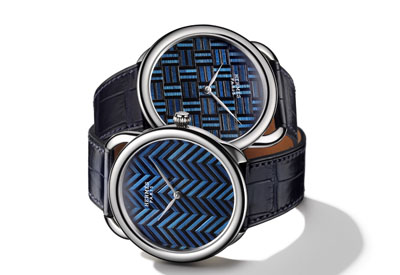 d’Origny于1978年所創(chuàng)作的Arceau系列,延續(xù)該系列經典的不對稱表耳造型,猶如方便環(huán)系馬鐙皮帶的外型設計,呼應愛馬仕馬鞍制作的世界。然而,Arceau獨特的斜體數字時標不見了,以便有更多空間將“麥桿鑲嵌”工藝呈現在表盤上。藍與黑組成的圖案,在直徑41毫米的白金表殼中,描繪出兩款象征愛馬仕標志的人字紋與小方形圖樣。 配備Vaucher專為愛馬仕制作的H1928自動上鏈機芯,此兩款新表擁有55