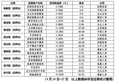 華寶證券統(tǒng)計,4月24日-4月27日,大部分投連險賬戶延續(xù)上揚趨勢,整體取得0.33%的平均收益,其中91.7%的賬戶實現(xiàn)正收益。但仍有國壽進取股票、友邦增長組合等多個賬戶以區(qū)間負收益的表現(xiàn)在各類型投連險賬戶中墊底。