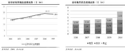 除了政策利好之外,被低估概念也頗具價值。中金公司認為,動物保健品行業(yè)就屬于這類被低估板塊,值得投資者關注。 該機構發(fā)布的報告稱: 中國快速增長的肉類蛋白需求帶動養(yǎng)殖業(yè)集約化生產方式的狂飆急進,對動物保健品的需求大幅增加。同時,在養(yǎng)殖業(yè)管理水平尚未完全邁入現(xiàn)代化的前提下,動物疫病頻發(fā)和大規(guī)模流行往往成為與養(yǎng)殖業(yè)規(guī)模化高速發(fā)展同時并存的現(xiàn)象,動物疫病已經成為近年來造成肉類價格和養(yǎng)殖業(yè)利潤水平大幅波動的罪魁禍首。在此背景下,國家動物疫病防治的十年規(guī)劃被提上日程,為動物保健品行業(yè)未來十年的發(fā)展打開了天窗。 作為養(yǎng)殖業(yè)的配套產業(yè),動物保健品行業(yè)必將長期受益于中國養(yǎng)殖業(yè)規(guī)模的增長和規(guī);B(yǎng)殖比例的提高而持續(xù)快速增長。 養(yǎng)殖業(yè)規(guī)模方面,中國人均肉類消費量未來仍有著數倍的增長空間。且根據發(fā)達國家經驗,中國人均GDP未來十年的發(fā)展將進入人均肉類消費量快速增長期。養(yǎng)殖業(yè)集中度方面,經驗表明規(guī)模化養(yǎng)殖比例的提高伴隨著頭均動物保健品投入量的大幅度增長;诖,根據我們的測算,中國動物保健品行業(yè)未來十年的增長空間達500%,對應復合增長率達20%,市場容量將從目前320億元成長至超過1900億元。 根據測算,中國動物保健品行業(yè)中生物制品的市場集中度為54%,而剔除強制免疫產品的常規(guī)疫苗市場集中度更低,獸藥、化藥、原料藥的集中度為39%,獸用制劑的集中度為18%,中獸藥的集中度為20%,與國際市場高達70%的市場集中度差距明顯。在新獸藥研發(fā)難度增加、技術壁壘提高,下游規(guī)模化養(yǎng)殖客戶對產品質量要求提升,以及國家不斷抬高行業(yè)準入門檻等因素的推動下,動物保健品行業(yè)本身的集中度水平有望持續(xù)提升,從而為領先的動物保健品企業(yè)贏得更為廣闊的增長前景。 國內獸藥行業(yè)在行業(yè)環(huán)境以及研發(fā)、生產和營銷等環(huán)節(jié)與成熟市場相比依然存在較大差距,相對于國際成熟市場,國內獸藥行業(yè)整體依然處于行業(yè)發(fā)展的早期階段。我們認為正是因為這種差異,與國際市場上人用醫(yī)藥企業(yè)紛紛通過并購方式進入獸藥業(yè)務領域不同,國內獸藥市場的競爭環(huán)境和市場特征對獸藥企業(yè)的吸引力不足,不會出現(xiàn)人用醫(yī)藥企業(yè)大規(guī)模進入獸藥領域的現(xiàn)象,為國內領先企業(yè)的發(fā)展壯大贏得了時間。 目前獸藥板塊估值水平的對照標的過度傾向于醫(yī)藥行業(yè),導致板塊整體估值水平較低。但即使從醫(yī)藥屬性的角度來看,目前獸藥行業(yè)龍頭企業(yè)估值水平仍存在低估現(xiàn)象。另一方面,由于獸藥行業(yè)需求來自高速發(fā)展的農業(yè)板塊,行業(yè)發(fā)展有很強的農業(yè)屬性,因此其估值水平理應分享農業(yè)板塊較高估值水平才更為合理。行業(yè)當前估值水平較歷史平均折扣較大,存在較大估值修復空間。我們結合不同公司PE和PEG水平,以及公司基本面情況首次給予瑞普生物“推薦”評級,首次給予大華農、天康生物、中牧股份“審慎推薦”評級。