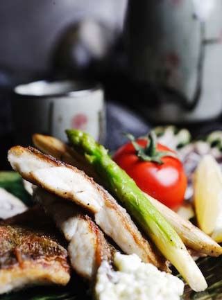微煎海鱸魚菲力配四川胡椒和西班牙式西紅柿泥佐小茴香佐普羅旺斯橄欖油