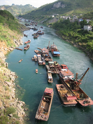 記者在大化瑤族自治縣巖灘水電站下游看到,幾十米寬的河道,航行著100多艘大小不一打撈奇石的船只,如同一條長龍,一眼望不到邊。