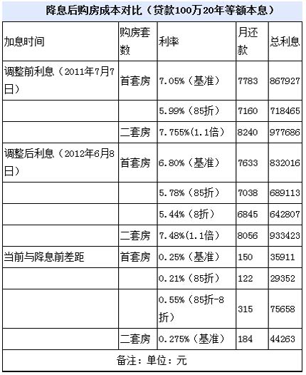 首套房100萬元20年期的房貸月供將可省下150元了。中國人民銀行于6月7日晚間宣布,自2012年6月8日起,將金融機構一年期貸款基準利率下調(diào)0.25個百分點。此外,央行同時將金融機構貸款利率浮動區(qū)間的下限調(diào)整為基準利率的0.8倍,這也意味著首套房貸8折優(yōu)惠有可能“重現(xiàn)江湖”。