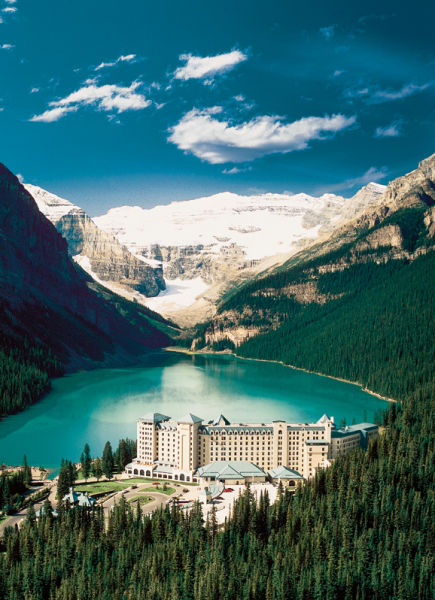 Victoria)倒映在一灣碧綠的湖水里,優(yōu)美寧靜。湖畔綠草如茵,繁花競放,超豪華的Chateau Lake Louise
