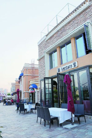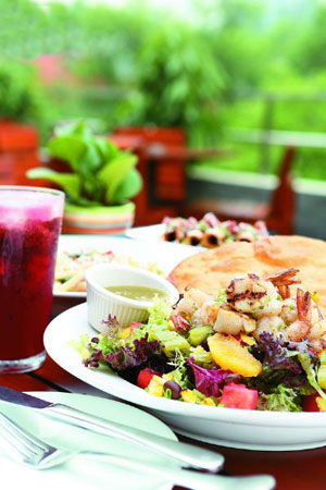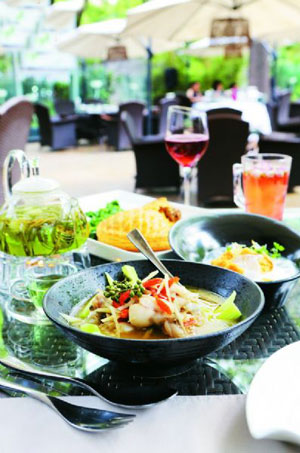 闌棠在藍色港灣的酒吧街一側,二樓的露臺是好多人醉心的地兒,露臺天擦黑的時候感覺最棒,旁邊是微微泛濫的湖水,身后是歐洲風情的建筑,還真有一點置身于海邊某家餐廳的錯覺。闌棠是泰餐廳,菜品方面推薦這里的香濃咖喱虎皮大蝦(120元),大個兒的開背虎皮蝦烹炸后配上泰式紅咖喱,味道鮮香勁辣、很過癮,喜歡紅咖喱的話,另外推薦一道紅咖喱牛肉(70元)味道也不錯,切成片狀的牛肉十分入味,同樣香辣。其他如鮮辣海鮮粉絲沙拉(50元)、冬陰功(75元)等都是不必多說的招牌菜式,水準不錯。酒水方面推薦一道闌堂鮮果雞尾酒(50元),酒里有很多水果碎,入口香甜,酒味不濃。