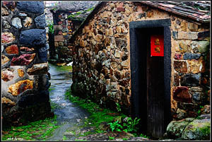 樟腳村由石頭壘砌而成的房屋群并不講究布局,有“混亂有致”這個詞嗎?沒有,就可以為樟腳創(chuàng)造一個出來了。即使在同一座房子的人家里,房間和房間之間的通路都由石階連接;戶和戶之間的通路也與此相似。石屋沒什么窗戶,有也都顯得太袖珍了,但類似天井的東西卻每戶都有。