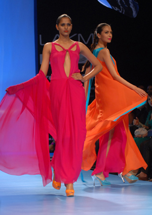 近日,在印度孟買舉行的拉克美時裝周上,模特展示印度設(shè)計師溫德爾·羅德里克斯的作品。85位設(shè)計師將在這次時裝周上展示自己的作品。
