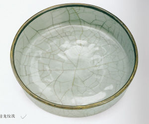 厘米,足徑12.3厘米。洗壁垂直微向外撇,平底,圈足寬而淺。通體灰青色釉,青翠如玉,釉汁肥厚凝重,釉面布滿了自然天成、縱橫交錯(cuò)的開片。洗口部鑲銅口,圈足露胎呈褐色,紫口鐵足的特征十分明顯。洗內(nèi)底印有一條蒼龍,其形象矯健勇猛,筆觸細(xì)微,但由于釉汁太厚,只有高光下才能顯現(xiàn),更增添了“神龍見首不見尾”的神秘之感。此洗釉色純正,造型古樸、大方,為官窯典型器物,并且印有龍紋,較為罕見!吨袊(guó)陶瓷發(fā)展史》一書記載過(guò)這種官窯洗,故宮博物院也收藏了這樣一件洗子,深受清代皇室喜愛,器底刻有乾隆御題詩(shī),可見其珍貴。