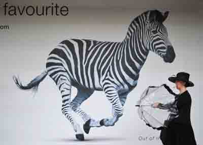 在英國(guó)伯克郡,一名準(zhǔn)備前往皇家阿斯科特賽馬會(huì)的女士走過一幅畫有斑馬的廣告牌。