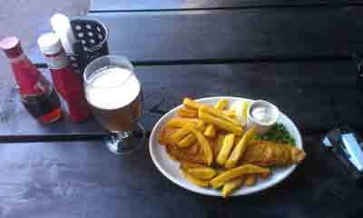 英國(guó)倫敦尤斯頓火車站旁一家餐館提供的英國(guó)傳統(tǒng)食品Fish and Chips。