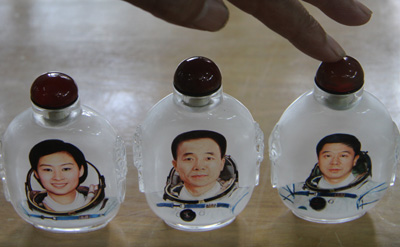 近日,中國(guó)工藝美術(shù)大師張汝財(cái)運(yùn)用傳統(tǒng)的內(nèi)畫藝術(shù)繪制了以神舟九號(hào)任務(wù)飛行乘組三位航天員為主題的內(nèi)畫作品。據(jù)悉,該肖像水晶球內(nèi)畫,將贈(zèng)送中國(guó)航天城永久展覽,3件內(nèi)畫鼻煙壺將分別贈(zèng)送給神舟九號(hào)任務(wù)飛行乘組三位航天員景海鵬、劉旺、劉洋收藏。
