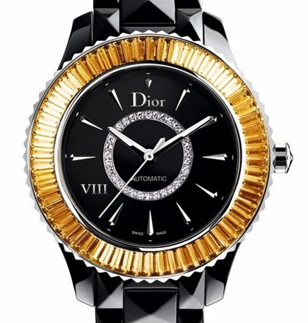 在2011年的時(shí)候,這種珠寶與時(shí)間的配合還僅僅是以白與黑相碰撞黑色的盤面搭配被鑲成鏈狀的鉆石條帶。這展現(xiàn)出了從品牌創(chuàng)立伊始,迪奧在顏色的選擇的傾向性:金色、白色與黑色通常都是第一選擇。然而克里斯汀·迪奧先生同樣也并不排斥使用其他的色彩:“黑色和白色足矣,但卻沒(méi)有理由剝奪使用其他顏色!币虼,在本年度的Dior