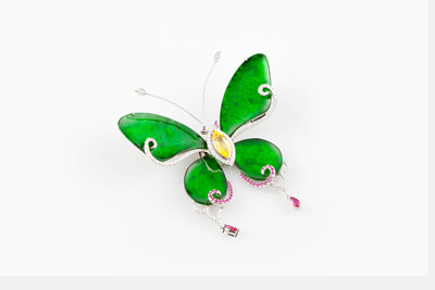 在清晨明亮的光線下,晶瑩的露珠在芳草上閃爍,更顯清新脫俗、嬌美可愛;翅膀閃耀著透明銀光的蝴蝶,在花間草葉上飛舞翩阡。“綠茵”系列透過精湛的切割技術(shù)與藝術(shù)設(shè)計(jì),轉(zhuǎn)化為自然界中姿態(tài)曼妙的造物,呈現(xiàn)輕盈婉轉(zhuǎn)的線條;讓翡翠珠寶不只適于配戴,更成為現(xiàn)代藝術(shù)珍藏。