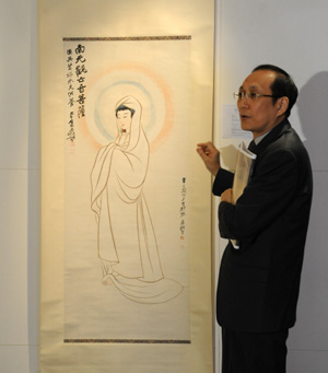 展出畫(huà)作中,有一幅1941年設(shè)色紙本立軸《白描觀音像》,為張大千初入敦煌時(shí)所畫(huà),與深受敦煌畫(huà)法影響的后期作品在風(fēng)格上有明顯差別,具有較高的藝術(shù)收藏價(jià)值。畫(huà)作被大師在上世紀(jì)60年代題款贈(zèng)友,畫(huà)與款年代相差十幾年,也成為趣事一樁。具有較高價(jià)值的還有1949年張大千初到臺(tái)灣時(shí),為答謝友人之子幫忙安頓而寫(xiě)贈(zèng)的水墨紙本鏡框《自畫(huà)小像》,僅有11厘米乘7.8厘米大小,是現(xiàn)今存世尺幅最小的張大千自畫(huà)像。
