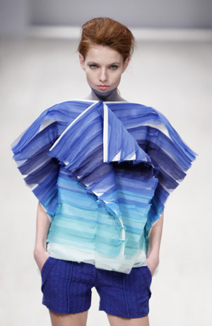10月14日,在烏克蘭基輔的2013春夏時裝周上,模特在展示烏克蘭設(shè)計師Victoria Panyukova的作品。