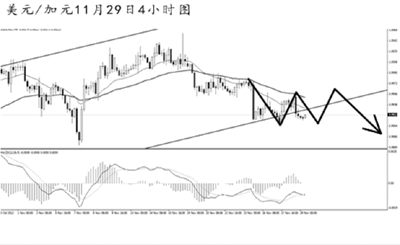 美元兌加元目前正在考驗日線圖上升通道下沿的支撐效果,短線匯價已經(jīng)圍繞此支撐反復(fù)震蕩多次,若跌破,將打開一定程度的下跌空間。4小時圖上看,由于匯價中間創(chuàng)出新低,故目前并沒有形成良好的次級趨勢調(diào)整。預(yù)計仍有進(jìn)一步下行的需求,關(guān)注通道下沿的跌破進(jìn)程。
