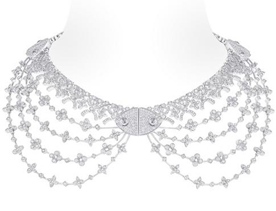 B?umer設(shè)計(jì),再次以品牌尊崇的旅游藝術(shù)為出發(fā)點(diǎn),將旅程概念超越地域所限,設(shè)計(jì)大膽創(chuàng)新,向古老的珠寶工藝及切割技術(shù)致敬之余,并散發(fā)濃厚婉約美態(tài)及時代感,每款設(shè)計(jì)都匯聚珠寶工藝精髓,不受時空及風(fēng)格所限。路易威登兩款專利切割花卉造型鉆石與靈活柔軟精致網(wǎng)狀鏤絲,盡顯品牌珠寶工匠的專業(yè)造詣,黃金物料覆上藍(lán)色陶粉又見技術(shù)創(chuàng)新。最能代表品牌歷史及美學(xué)神韻的Monogram花卉以不同面貌亮相,變化多端更顯其豐富內(nèi)涵深度。Voyage