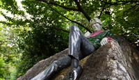 走在都柏林老舊的街區(qū)中,隨時可以感受逝去的作家文人們留在某個角落里的靈魂。街頭隨處可見各式各樣的雕塑,其中文學(xué)家的雕像占了很大比例。我住的酒店旁邊就是梅里昂廣場(Merrion Square),幽靜的中心花園中,綠蔭下一個中年人懶洋洋地倚在一塊大石頭上,一副滿不在乎的表情,略帶挑釁地注視著每個經(jīng)過的人。這不同尋常的雕塑便是蜚聲文壇、才華橫溢的作家奧斯卡·王爾德(Oscar Wilde)。