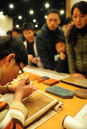 圖為參觀者在遼寧珍貴古籍特展上觀看工作人員雕版刻字。