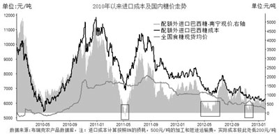 北京中期分析稱,盡管國(guó)內(nèi)對(duì)進(jìn)口食糖實(shí)施配額管理,但是一旦國(guó)內(nèi)外食糖價(jià)差過于懸殊,即使按50%的配額外稅率進(jìn)口也有利可圖,在2012年4至6月就曾持續(xù)出現(xiàn)過上述情況,結(jié)果造成進(jìn)口糖數(shù)量大增,嚴(yán)重沖擊了國(guó)內(nèi)食糖市場(chǎng)。